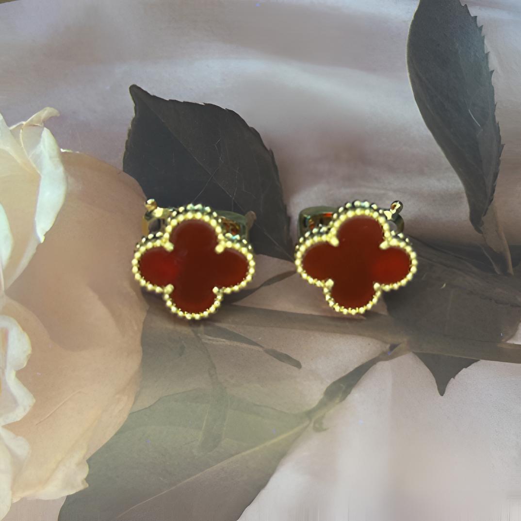 18K黄金四叶草耳拍 15mm纯天然红玛瑙柜版耳饰耳钉 高奢大气时尚